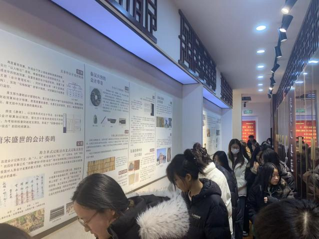 走进庄重典雅的会计文化传承中心,新生们瞬间被浓厚的文化氛围所吸引。在讲解员的引导下,大家沿时间轴探索,从大禹贡赋制度、殷墟甲骨会计卜辞,到“四柱清册”、“龙门账”、木质算盘……大家触摸会计的历史脉络。名人堂中,大家认真学习领悟孔子“会计当而已矣”理念、潘序伦“中国现代会计之父”事迹、“三坚三守”职业操守和朱镕基总理十六字题词,深化思政教育。
