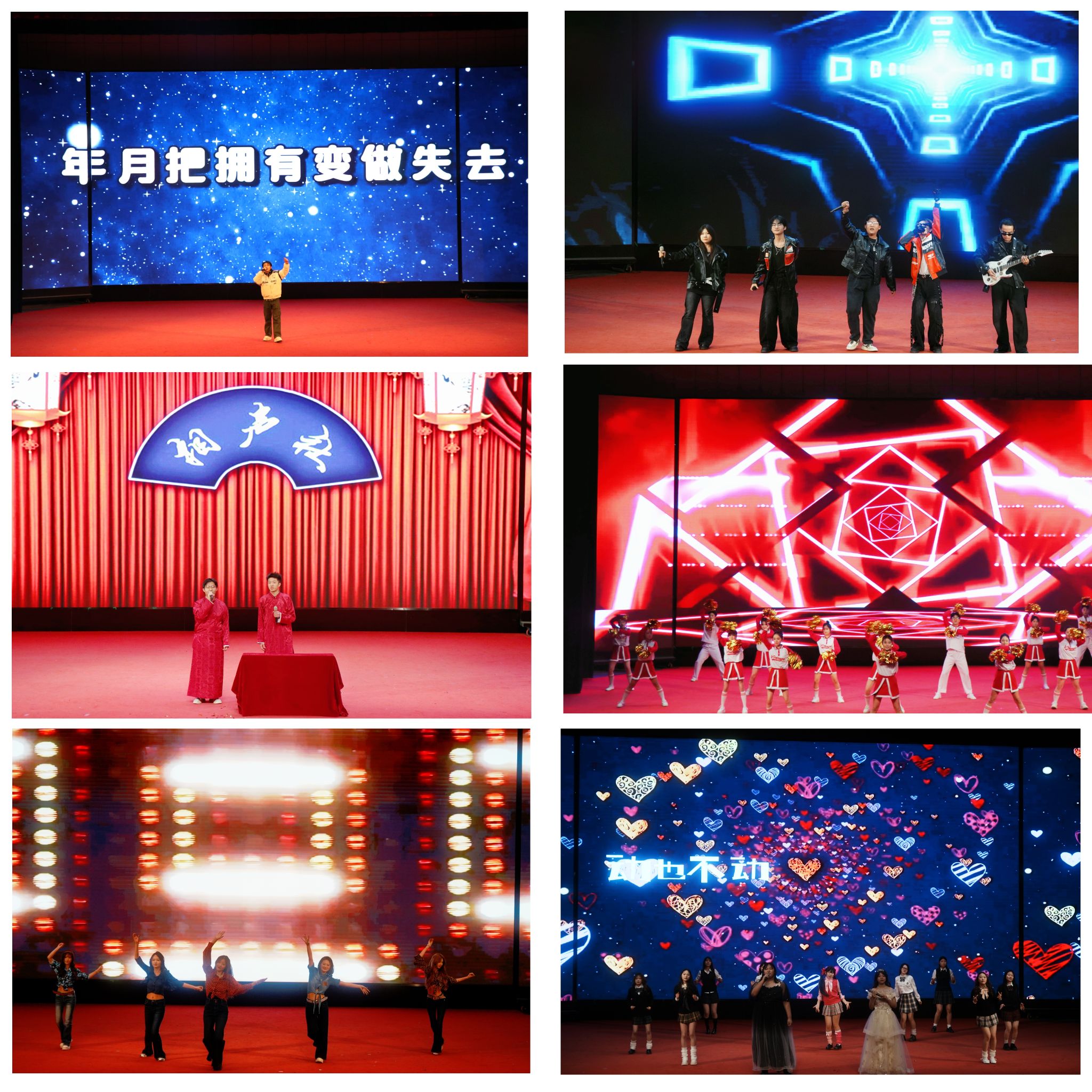 伴随着动感的节拍,活力四射的啦啦操表演拉开了汇演的序幕。队员们用整齐划一的动作、饱满昂扬的姿态瞬间点燃全场气氛,台下掌声与欢呼声此起彼伏。汇演节目形式多样、精彩纷呈,汇聚了歌曲、相声、走秀、舞蹈、歌伴舞等多个类型。歌曲演唱时而深情婉转,时而高亢嘹亮,唱出了青年学子的赤诚与热烈;相声表演妙语连珠、包袱不断,幽默诙谐的台词引得观众捧腹大笑;走秀节目中,同学们身着特色服饰,自信迈步,尽显时尚魅力与创意巧思;舞蹈与歌伴舞节目更是将汇演推向高潮,舞者们用灵动的舞步、优美的身段,诠释着青春的蓬勃朝气,每一个动作都传递出满满的感染力。