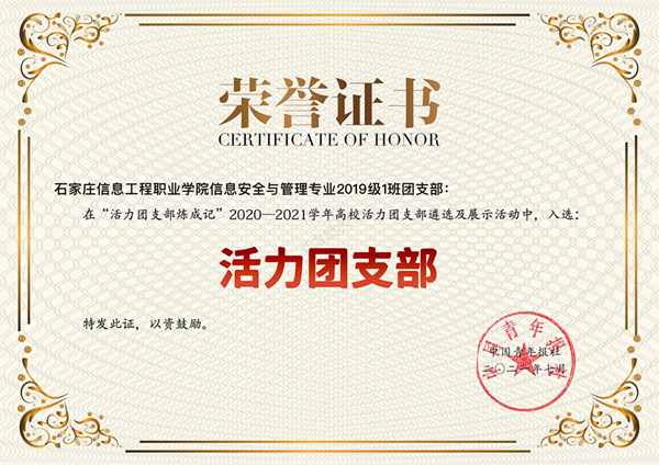 本网讯(通讯员 吴培培)近日,由团中央基层建设部、中国青年报主办的2020-2021学年高校“活力团支部”遴选及展示活动落下帷幕。经过校级申报、省级初评、展示点赞和全国终审等环节,beat365英国官网软件工程系信息安全与管理2019级1班团支部荣获“2020-2021学年全国高校活力团支部”荣誉称号。