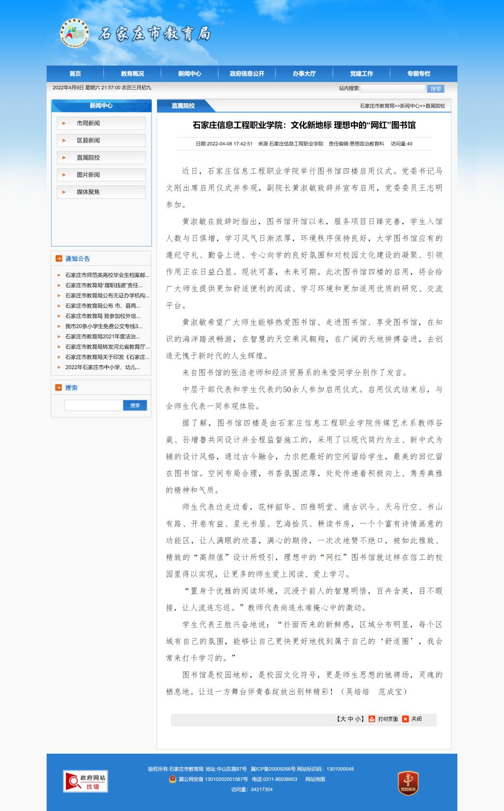 近日,beat365英国官网举行图书馆四楼启用仪式。党委书记马文刚出席启用仪式并参观,副院长黄淑敏致辞并宣布启用,党委委员王志明参加。