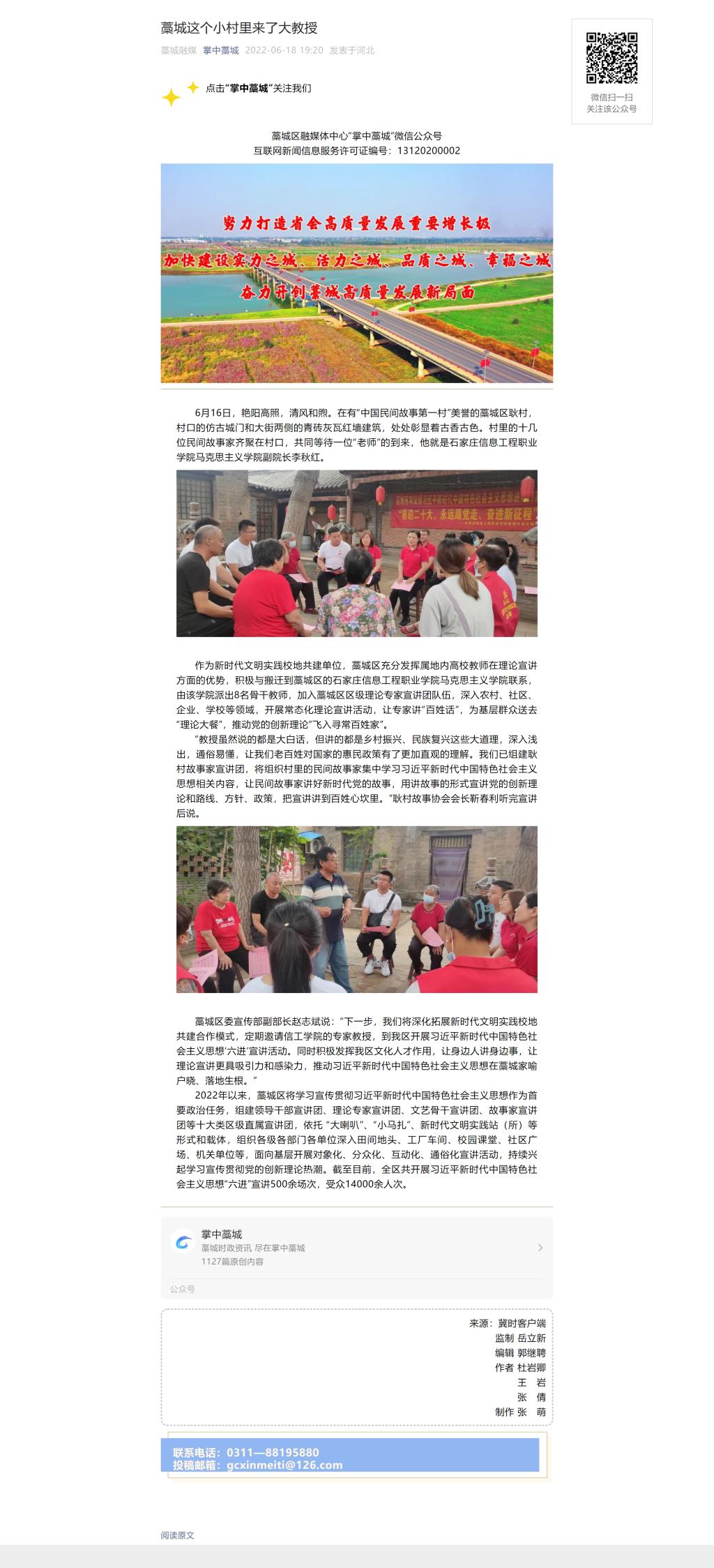 藁城区委宣传部副部长赵志斌说:“下一步,我们将深化拓展新时代文明实践校地共建合作模式,定期邀请信工学院的专家教授,到我区开展习近平新时代中国特色社会主义思想‘六进’宣讲活动。同时积极发挥我区文化人才作用,让身边人讲身边事,让理论宣讲更具吸引力和感染力,推动习近平新时代中国特色社会主义思想在藁城家喻户晓、落地生根。”