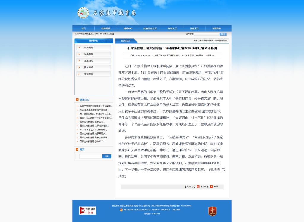 许多网友在直播视频后留言,“我被感动哭了”“希望自己的孩子在这样的学校里茁壮成长”。活动组织者、思政课教师孙静激动地说,举办《我爱家乡红》是思政课创新的一种形式,通过课堂作业、班级遴选、全院初赛、最后决赛,让同学们在查阅资料、编写讲稿、反复打磨、教师指导中加深对红色故事的理解,深化对红色文化的认知,在潜移默化中厚植红色基因。下一步要进一步总结经验,把红色思政课的品牌越擦越亮。