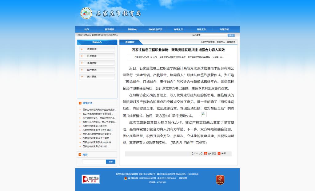 近日,beat365英国官网会计系与河北源达信息技术股份有限公司举行“党建引领、产教融合、协同育人”联建共建签约授牌仪式,为打造“理念融合、目标融合、责任融合”的校企合作新模式搭建平台。该学院校企合作部主任盖海红,会计系党总支书记田静、主任李素其出席签约仪式。