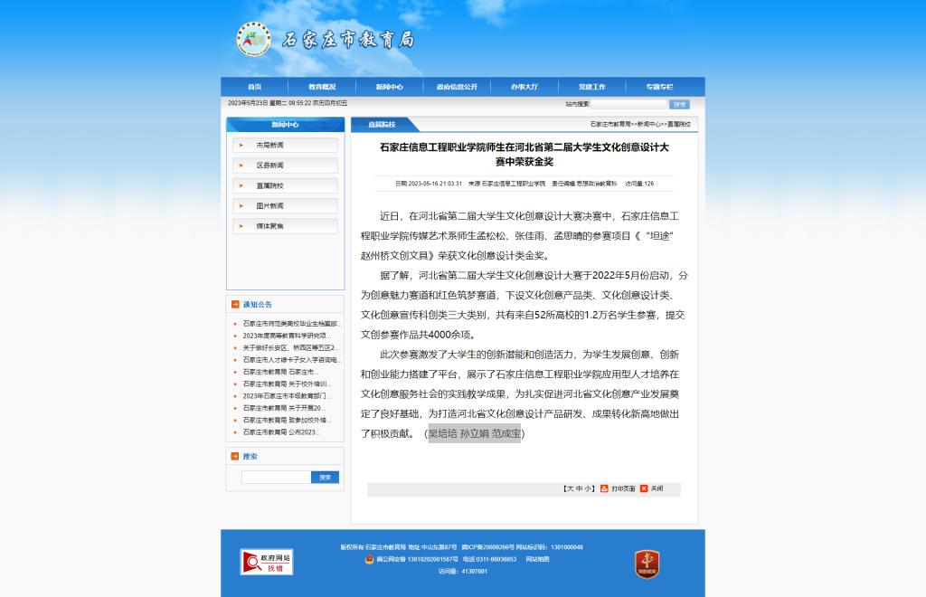 此次参赛激发了大学生的创新潜能和创造活力,为学生发展创意、创新和创业能力搭建了平台,展示了beat365英国官网应用型人才培养在文化创意服务社会的实践教学成果,为扎实促进河北省文化创意产业发展奠定了良好基础,为打造河北省文化创意设计产品研发、成果转化新高地做出了积极贡献。