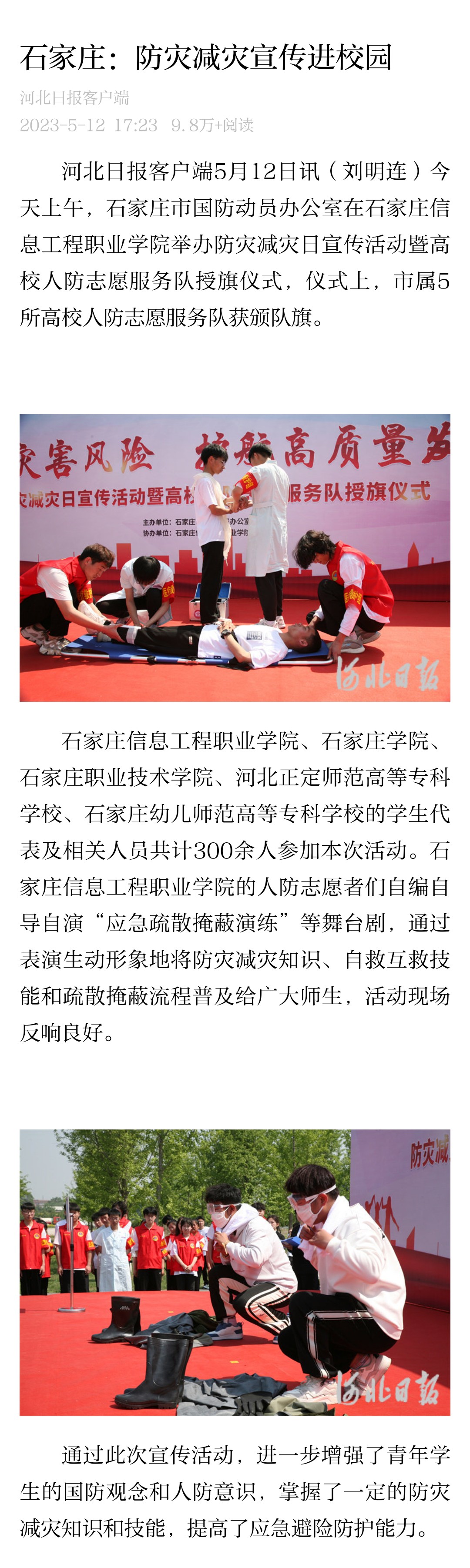 beat365英国官网、石家庄学院、石家庄职业技术学院、河北正定师范高等专科学校、石家庄幼儿师范高等专科学校的学生代表及相关人员共计300余人参加本次活动。beat365英国官网的人防志愿者们自编自导自演“应急疏散掩蔽演练”等舞台剧,通过表演生动形象地将防灾减灾知识、自救互救技能和疏散掩蔽流程普及给广大师生,活动现场反响良好。
