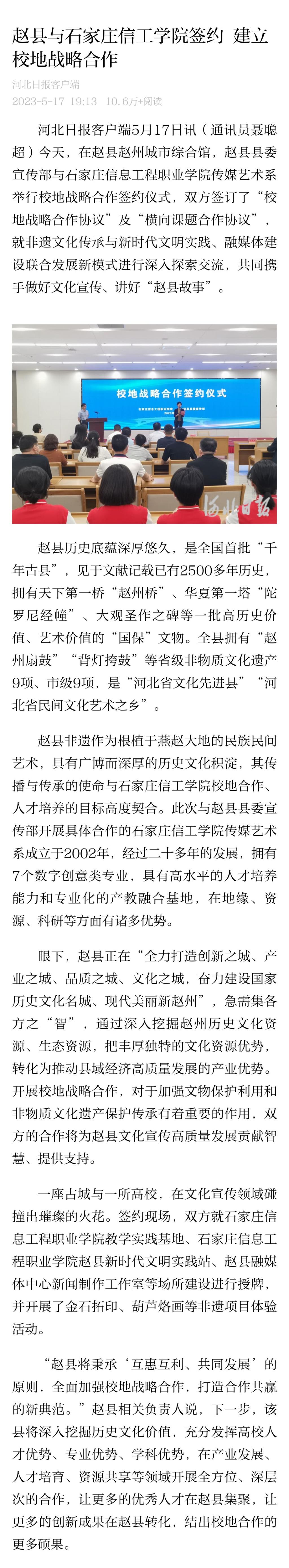 眼下,赵县正在“全力打造创新之城、产业之城、品质之城、文化之城,奋力建设国家历史文化名城、现代美丽新赵州”,急需集各方之“智”,通过深入挖掘赵州历史文化资源、生态资源,把丰厚独特的文化资源优势,转化为推动县域经济高质量发展的产业优势。开展校地战略合作,对于加强文物保护利用和非物质文化遗产保护传承有着重要的作用,双方的合作将为赵县文化宣传高质量发展贡献智慧、提供支持。