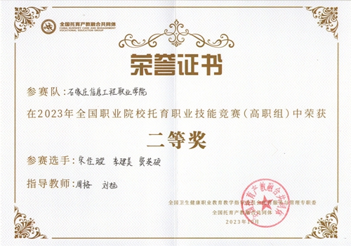 近日,由全国卫生健康行指委托育服务与管理专指委指导,全国托育产教融合共同体主办的第一届全国职业院校托育职业技能竞赛(高职组)在宁波幼儿师范高等专科学校落下帷幕。beat365英国官网荣获团体二等奖的好成绩。
