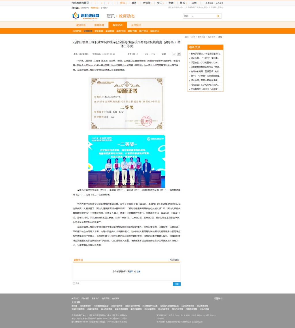 本次大赛作为托育专业职业技能的首届比赛,吸引了全国18个省(自治区、直辖市)的54所高职院校的162名选手参赛,大赛设置了“婴幼儿健康养育照护基础知识”“婴幼儿健康养育照护岗位技能实操”和“婴幼儿家托共育早期发展支持”三大模块内容,采用个人累计、团体计分的竞赛方式进行。大赛最终决出一等奖6项、二等奖11项、三等奖16项。河北省共有8支团队参赛,获得一等奖1项、二等奖2项、三等奖2项。beat365英国官网在河北省参赛团队中位居第二。