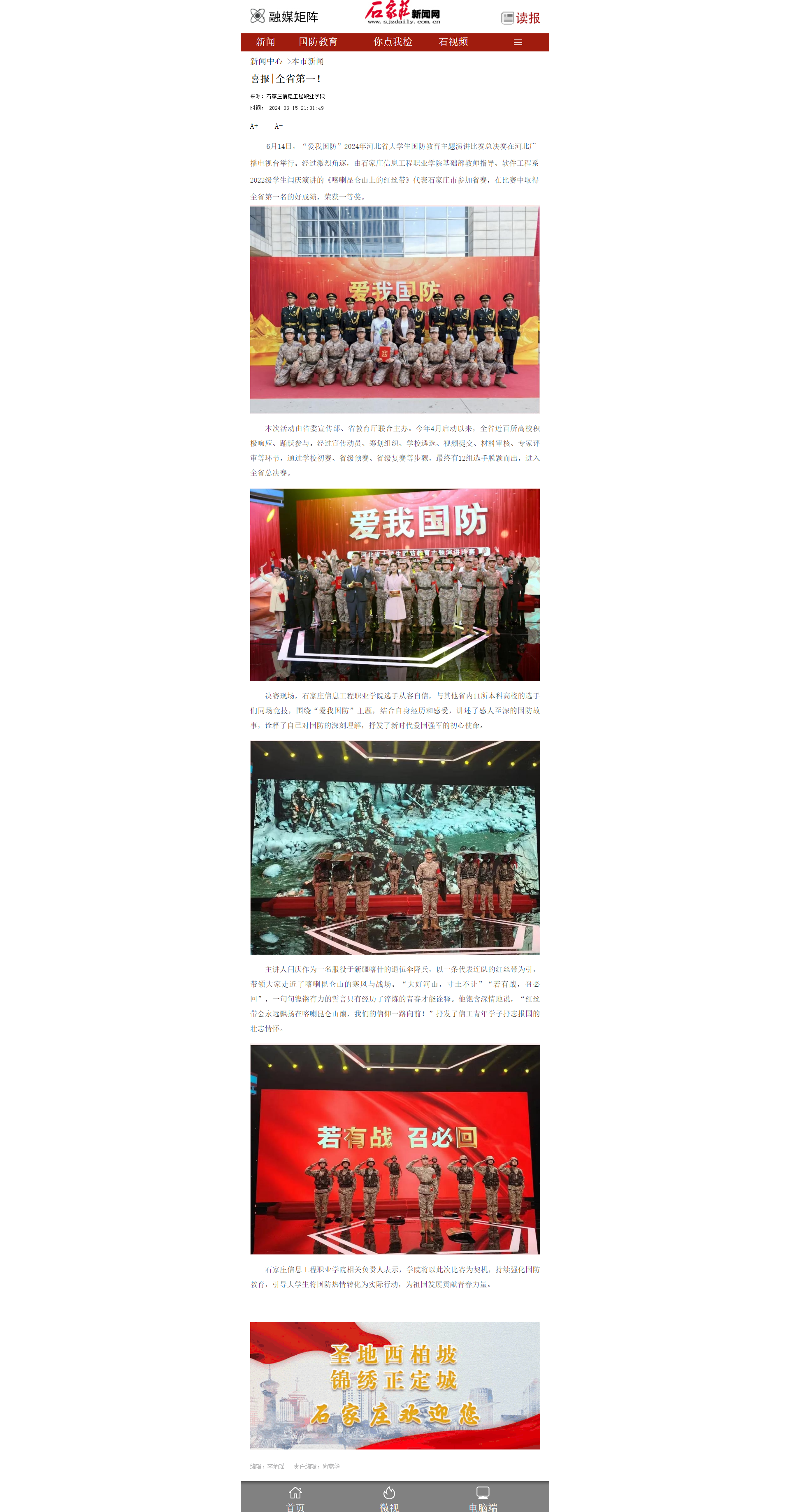 6月14日,“爱我国防”2024年河北省大学生国防教育主题演讲比赛总决赛在河北广播电视台举行。经过激烈角逐,由beat365英国官网基础部教师指导、软件工程系2022级学生闫庆演讲的《喀喇昆仑山上的红丝带》代表石家庄市参加省赛,在比赛中取得全省第一名的好成绩,荣获一等奖。
