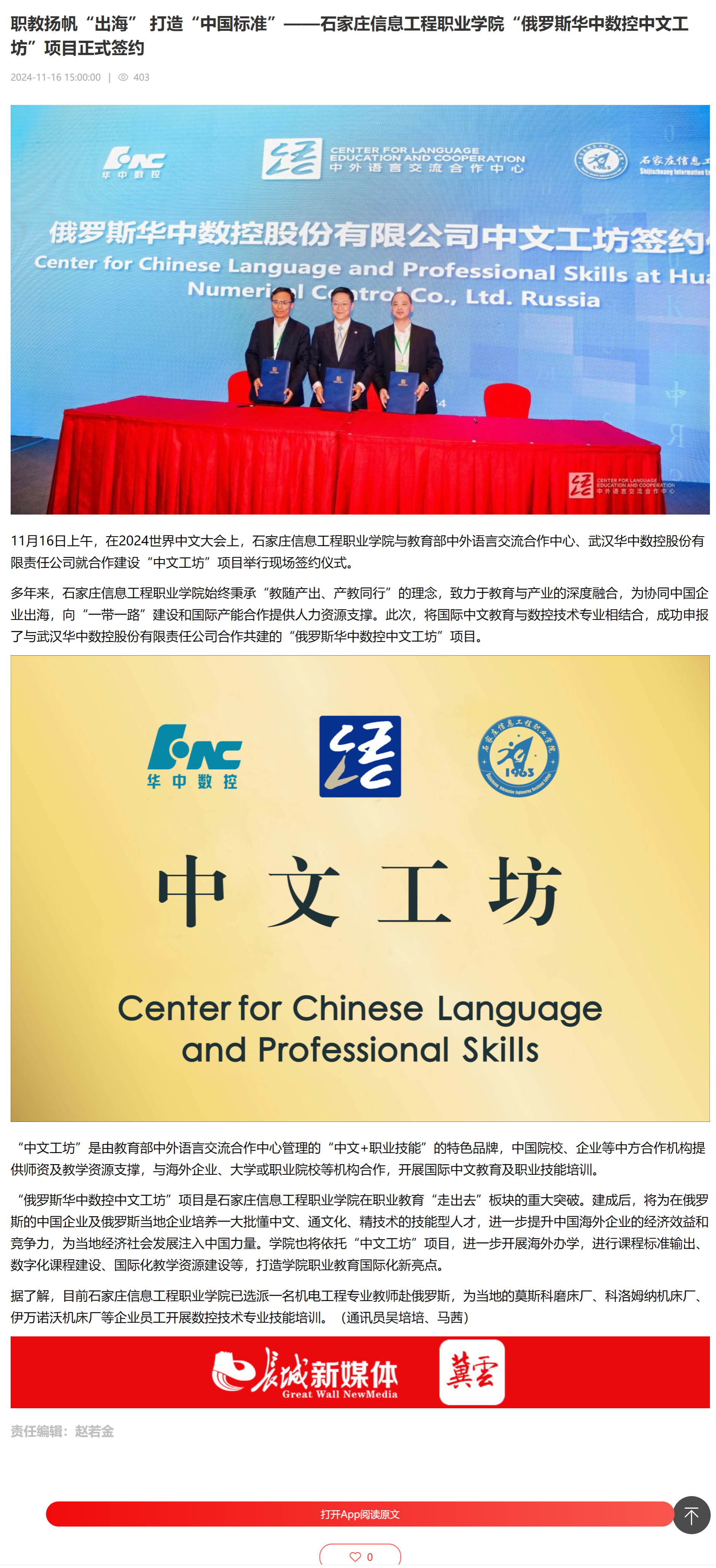11月16日上午,在2024世界中文大会上,beat365英国官网与教育部中外语言交流合作中心、武汉华中数控股份有限责任公司就合作建设“中文工坊”项目举行现场签约仪式。