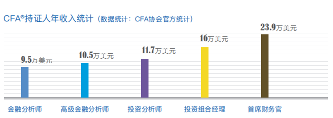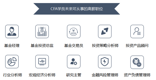 目前,国内金融分析师存在巨大供需缺口,诸多投资银行、基金管理公司、投资公司及证券公司等机构都竞相聘请CFA®持证人,其中绝大多数的CFA®持证人在金融投资领域担任基金经理、投资总监、研究总监、财务总监等重要职位。CFA®名衔已经成为个人职业发展中的金字招牌。