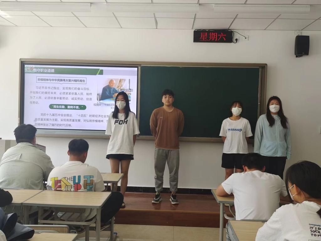 “思想道德与法治”课程在教学周第11周安排了“职业生活中的道德规范”单元教学,并给大一全体学生讲授和传达了如何树立正确的劳动观、择业观和创业观,并介绍“劳模精神”的典范模范,“蓝领专家”孔祥瑞、“金牌工人”窦铁成、“新时代雷锋”徐虎、“知识工人”邓建军等劳动模范。弘扬劳模精神、劳动精神、工匠精神,引发学生思考和讨论。学生学习了劳动模范的榜样人物,感悟了劳模精神的精髓。