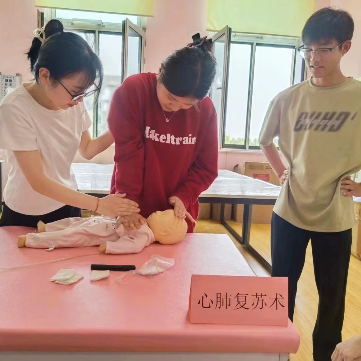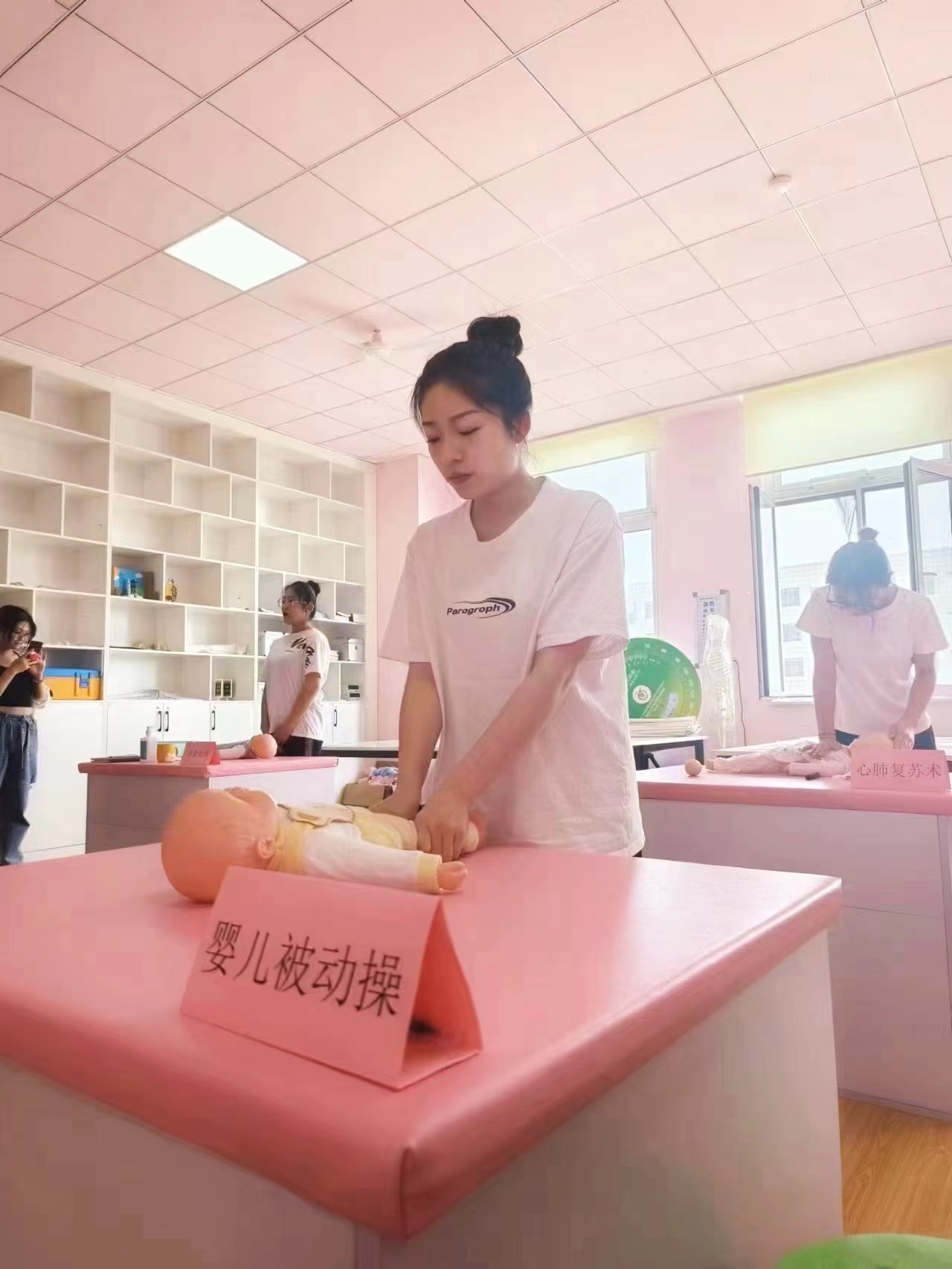 本次活动于2023年5月18日下午在beat365知新1号楼236教室(西)——婴幼儿保育实训室举办,诚邀学院老师、22级婴幼儿托育与服务管理专业及其他各专业在校学生参与活动。活动由王乐、杨松涛老师进行实操指导,来自21级婴幼儿托育与服务管理专业的学生张子涵、王伊、赵佳乐、徐子茗、吴英迪、许嘉琪同学为前来学习体验的老师和同学们在操作台上分别展示了更换纸尿裤、婴儿抚触、婴幼儿心肺复苏术、婴儿被动操、婴儿包被、婴幼儿误食处理这六项婴幼儿保健与照护技能。