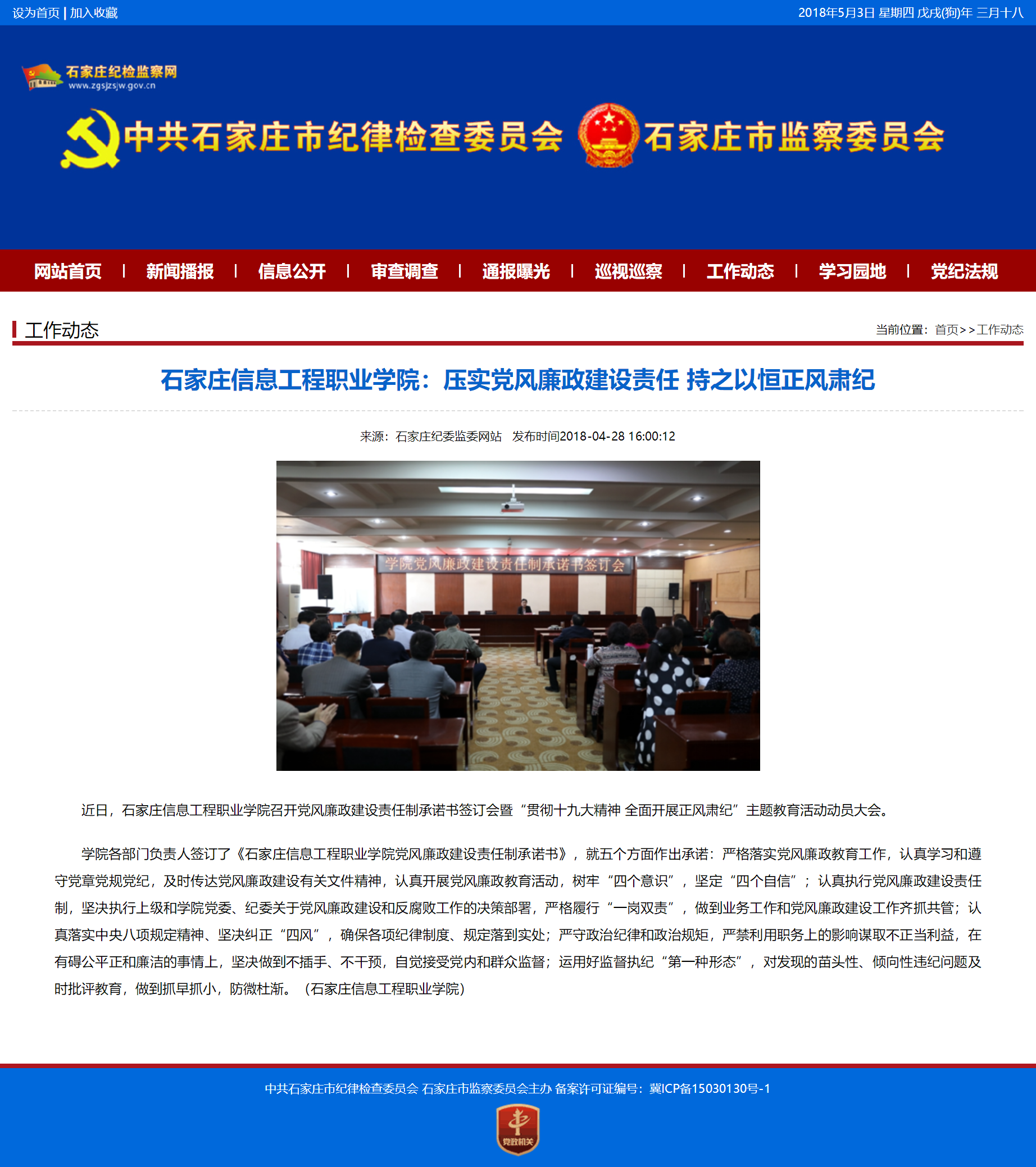 石家庄市纪委监委网站对beat365召开党风廉政建设责任制承诺书签订会予以报道