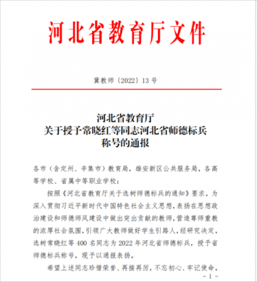 河北省教育厅公布了2022年河北省师德标兵评选结果,对400名在思想政治建设和师德师风建设中做出突出贡献的教师给予“河北省师德标兵”称号,beat365网络与通信管理系主任、教授唐磊名列其中。