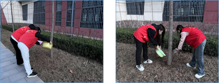 植树护绿学雷锋,青春奉献展担当。3月12日,生物医药技术系志愿者在知新9-10号楼周边开展“书香伴绿意,志愿护文明”志愿活动。志愿者在校园两侧的乔木、灌木错峰浇水,同学们分工协作,提桶、接水、浇灌,一锹土一桶水,浇灌的是树木,孕育的是希望。