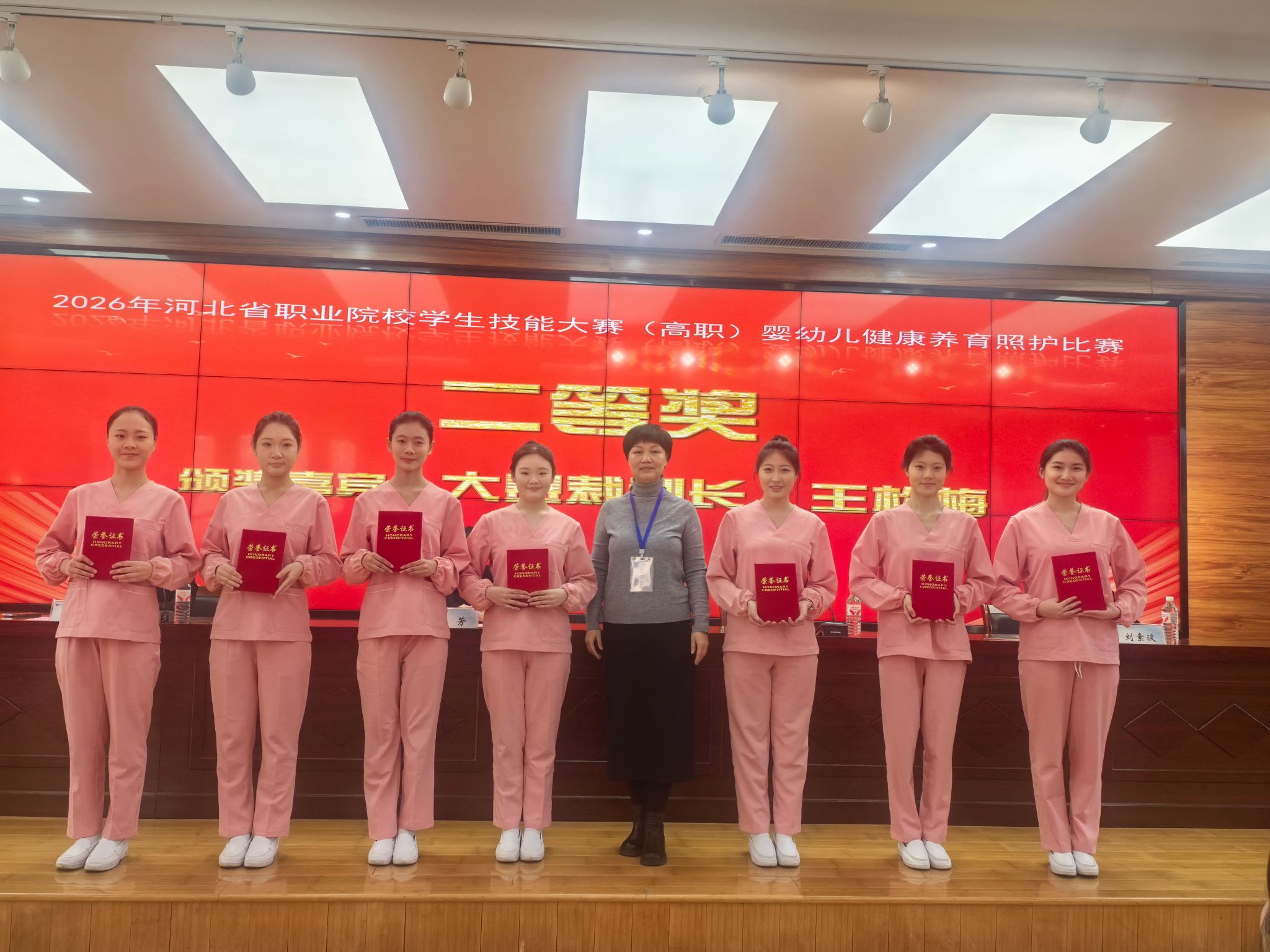 近日,由河北省教育厅主办,河北省卫生职业教育集团、河北女子职业技术学院承办的2026年河北省职业院校技能大赛(高职)婴幼儿健康养育照护比赛成功举办。来自全省11所高职院校的参赛队伍同台竞技,beat365生物医药技术系婴幼儿托育服务与管理专业张子涵、黄亚美、段希媛三名同学组成的参赛团队,在刘旭、栗慧萍老师的指导下,顽强拼搏,斩获大赛二等奖。