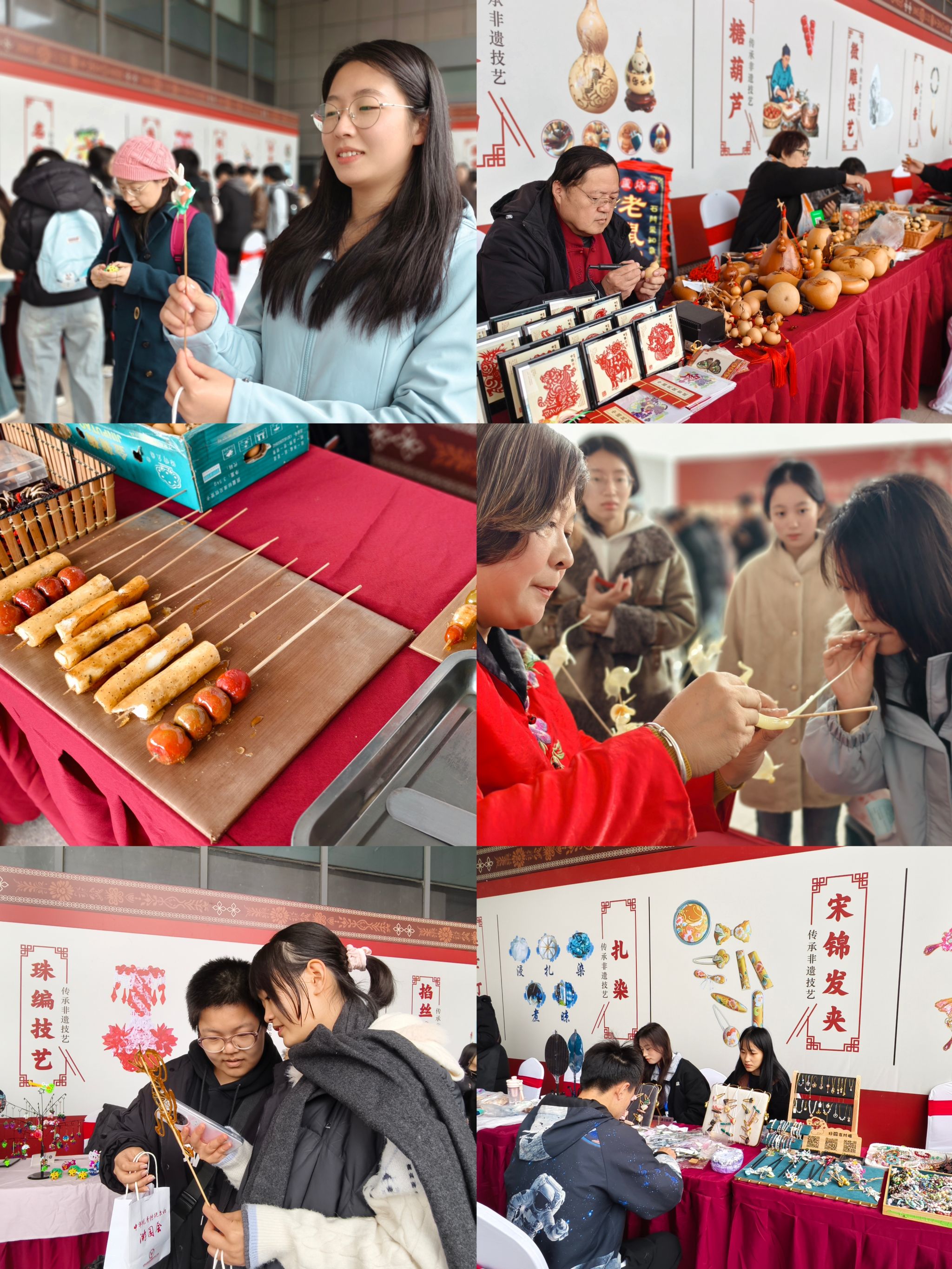 来自传媒艺术系24级数字媒体技术4班的张奋乐同学说:“这次游园会让我真切感受到了非遗文化的鲜活与魅力。以前只在书本上见过微雕、掐丝镶嵌,今天竟然能亲眼看到传承人老师现场演示,甚至手把手教我们创作。我尝试了扎染和糖画制作,从捆扎到染色,每一道工序都蕴含着匠人的巧思与耐心。”24级电子商务5班的郭瑞鑫说:“这次活动不仅让我学会了技艺,更让我体会到“守艺”背后的坚守与热爱,我们年轻一代也应当成为非遗传承的星星之火。”软件工程系辅导员赵卜丽老师全程参与,体验了多个非遗项目,她表示,“这场游园会是一次非遗教育与美育实践的深度融合。许多学生通过捏面人、草编等互动,自发探究起民俗背后的历史渊源与地域特色。”