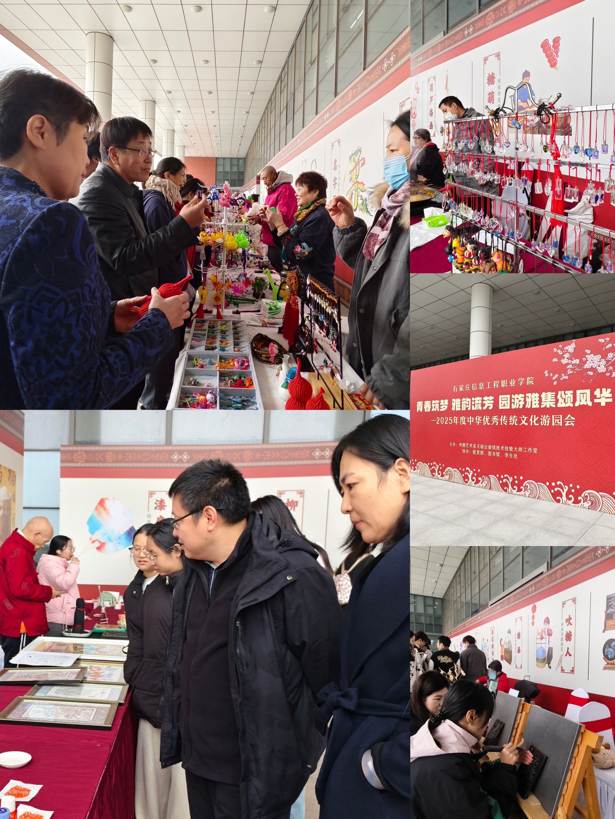 游园会特邀众多非遗传承人亲临现场,通过技艺演示、互动教学与沉浸式体验,带领师生近距离感受非遗魅力,并亲手制作了独具特色的非遗作品。活动现场特设“王丽云剪纸技术技能大师工作室”“方士英石影雕技术技能大师工作室”展位,更有捏面人、绳结技艺、吹糖人、糖画、珠编、名字画、柳沟草编、微雕、葫芦烙画、钩编技艺、棉花糖、鲁班锁制作、绒花制作、掐丝珐琅、扎染、漆扇、金石传拓、武强年画、中药香囊制作、合香、百福米、金箔画制作、螺钿技艺、宋锦发夹制作、冰糖葫芦等三十项非遗体验同步开展,生动呈现传统工艺的多样风采。