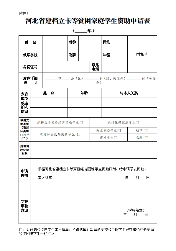 河北省建档立卡等贫困家庭学生资助申请表