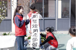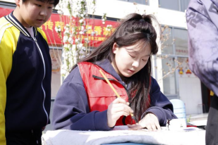 之后,书法社的5名同学分别用楷书、行书、隶书、篆书、草书五种不同的字体书写了“向雷锋同志学习”的字样。他们挥毫泼墨,笔锋流转间展现出书法的灵动与韵味。这一环节不仅展示了书法的多样性,更通过书写雷锋精神的主题,将书法艺术与思想教育相结合,让孩子们在学习书法的同时,接受精神的洗礼。